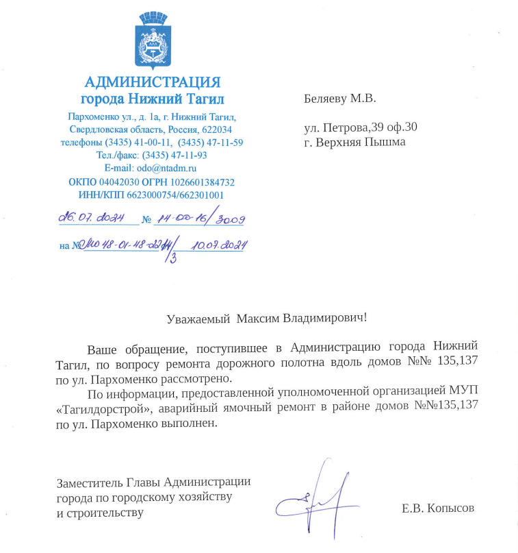 Ответ из Нижнего Тагила по вопросу ремонта дороги по ул. Пархоменко