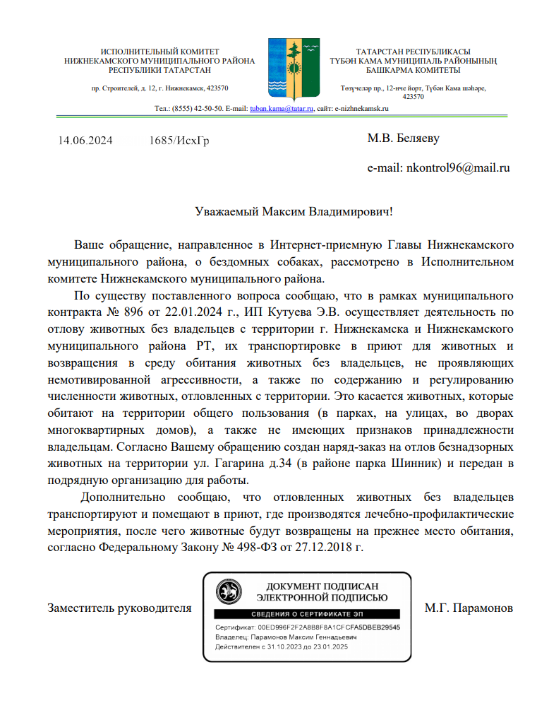 По существу поставленного вопроса сообщаю, что в рамках муниципального контракта № 896 от 22.01.2024 г., ИП Кутуева Э.В. осуществляет деятельность по отлову животных без владельцев с территории г. Нижнекамска и Нижнекамского муниципального района РТ, их транспортировке в приют для животных и возвращения в среду обитания животных без владельцев, не проявляющих немотивированной агрессивности, а также по содержанию и регулированию численности животных, отловленных с территории. Это касается животных, которые обитают на территории общего пользования (в парках, на улицах, во дворах многоквартирных домов), а также не имеющих признаков принадлежности владельцам. Согласно Вашему обращению создан наряд-заказ на отлов безнадзорных животных на территории ул. Гагарина д.34 (в районе парка Шинник) и передан в подрядную организацию для работы.