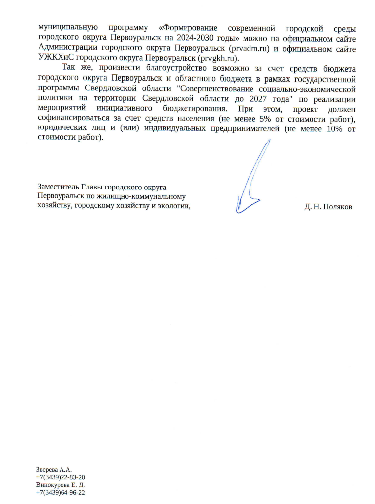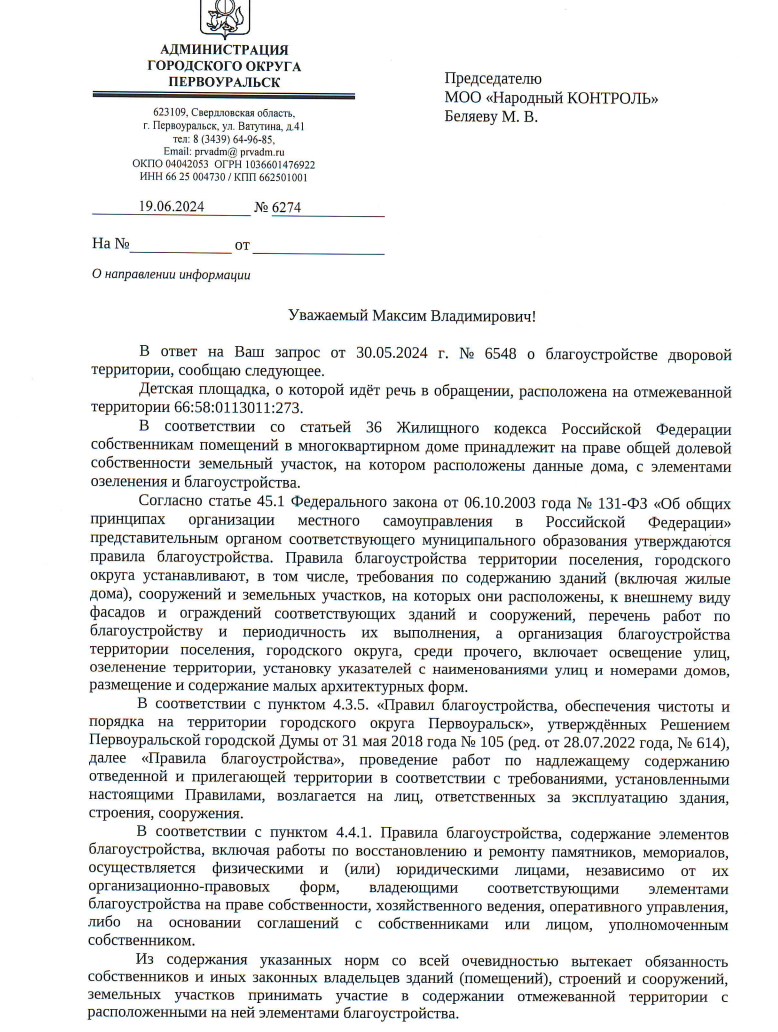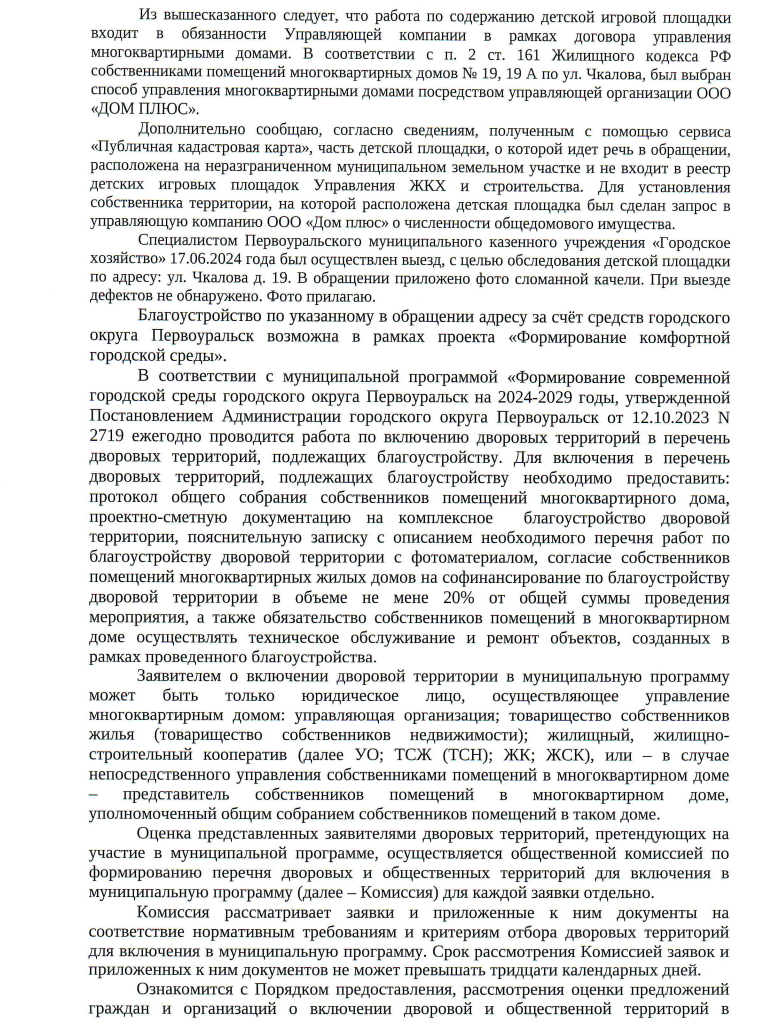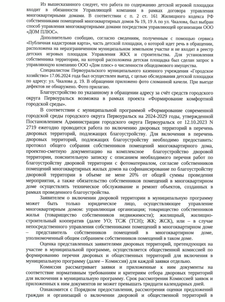 Ответ из Первоуральска по вопросам благоустройства детской площадки в доме на ул. Чкалова