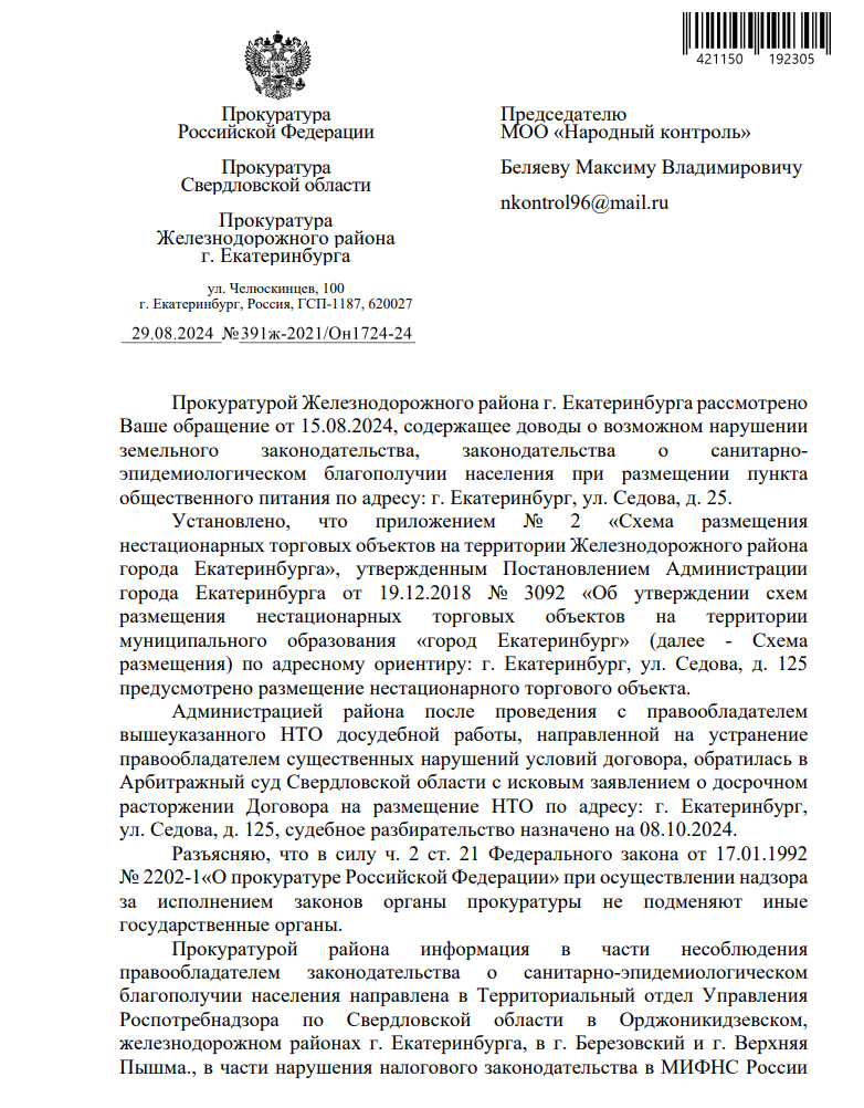 Прокуратурой Железнодорожного района Екатеринбурга рассмотрено ваше обращение от 15.08.2024 о возможном нарушении земельного законодательства и законодательства о санитарно-эпидемиологическом благополучии населения при размещении пункта общественного питания по адресу: Екатеринбург, ул. Седова, д. 25.