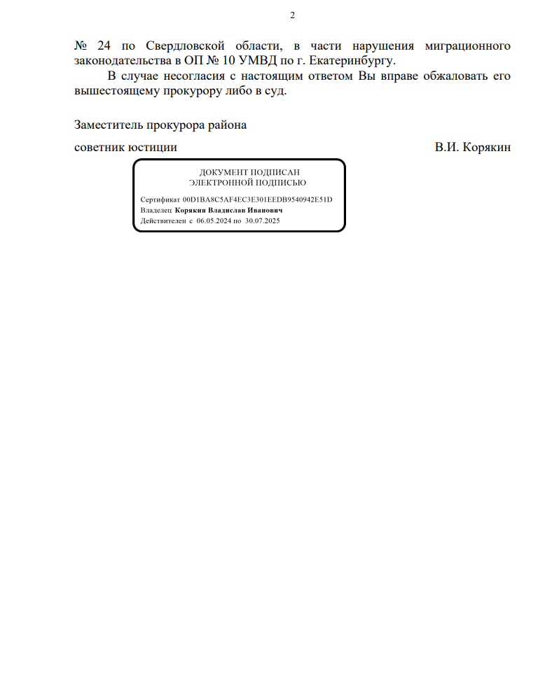 Прокуратура района направила информацию о несоблюдении правообладателем законодательства о санитарно-эпидемиологическом благополучии населения в Роспотребнадзор, а также информацию о нарушениях налогового и миграционного законодательства в соответствующие государственные органы.