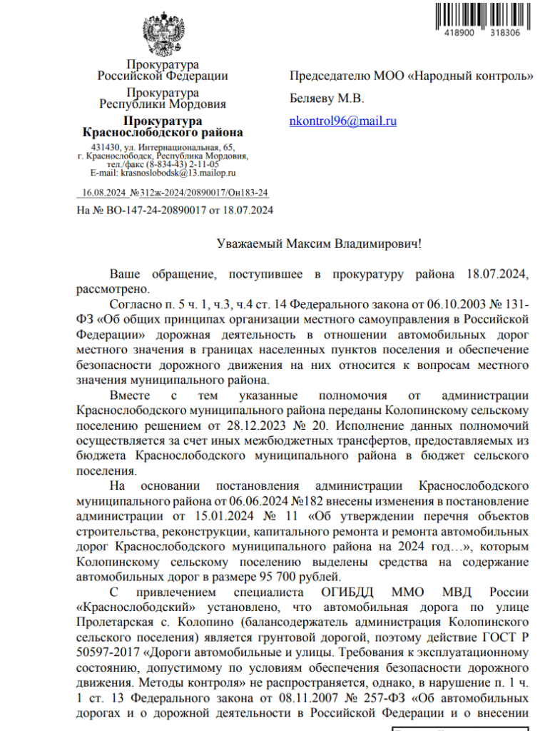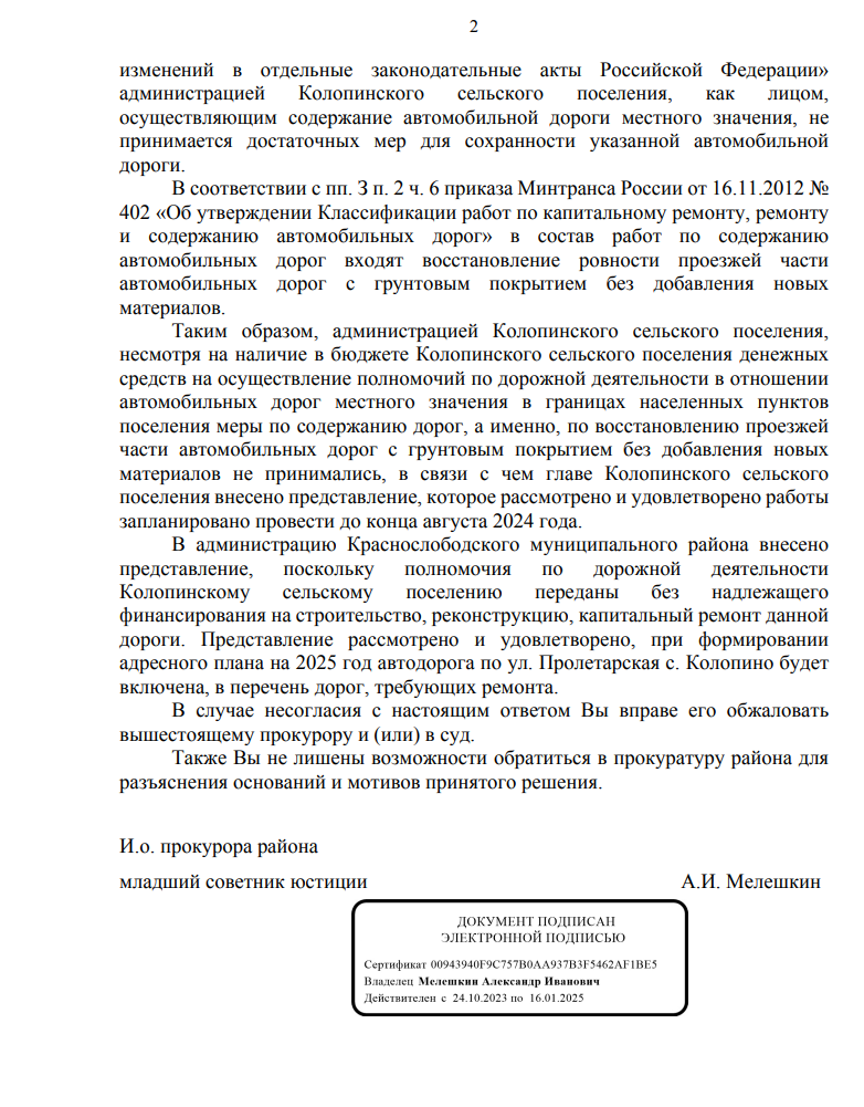 Ответ из прокуратуры по вопросу разбитой дороги в с. Колопино