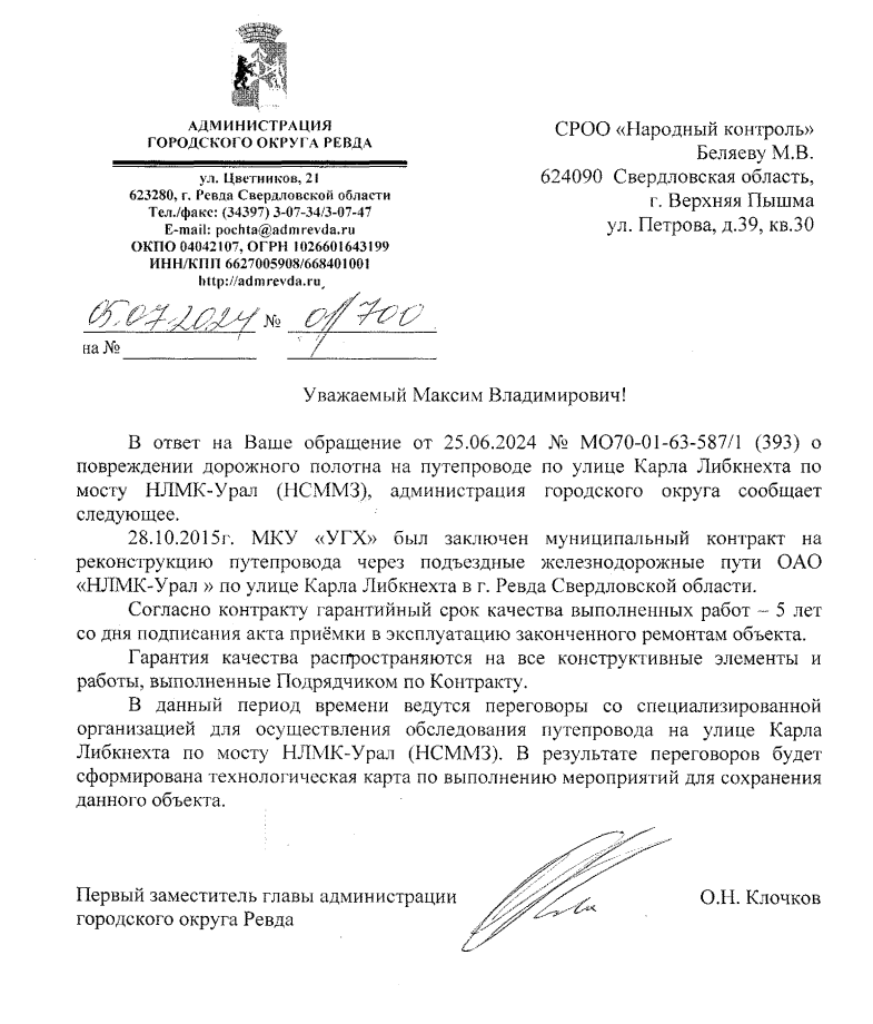 Администрация городского округа сообщает о повреждении дорожного полотна на путепроводе по ул. Карла Либкнехта. Гарантийный срок качества работ — 5 лет. Сейчас ведутся переговоры со специализированной организацией для обследования путепровода.