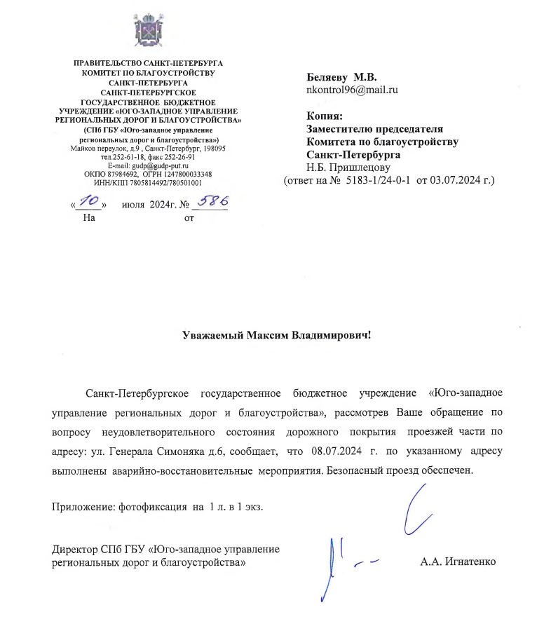 Ответ из Санкт-Петербурга по вопросу ремонта дороги по ул. Генерала Симоняка