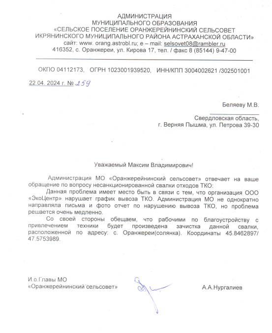 Публикуем ранее поступивший ответ по обращению жителей села Оранжереи Астраханской области по вопросу свалки несанкционированной свалки.