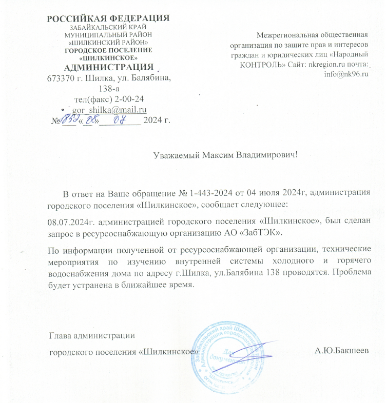 В ответ на Ваше обращение № 1-443-2024 от 04 июля 20241, администрация городского поселения «Шилкинское», сообщает следующее: