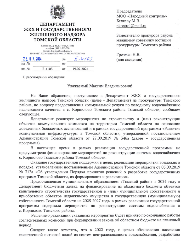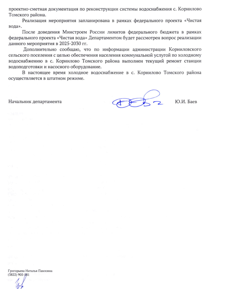 Ответ из Томска по вопросу отсутствия водоснабжения в с. Корнилово