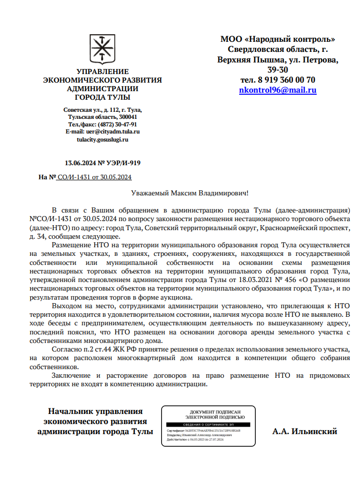 Публикуем ранее поступивший ответ по обращению жителей города Тула по вопросу законности размещения НТО на ул.