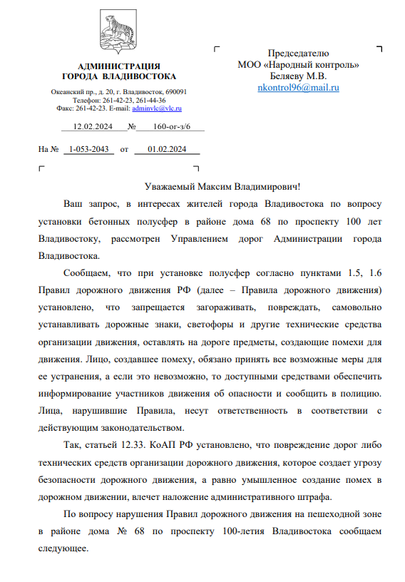 Ответ на запрос по вопросу установки бетонных полусфер в районе дома 68 по проспекту 100 лет Владивостоку.