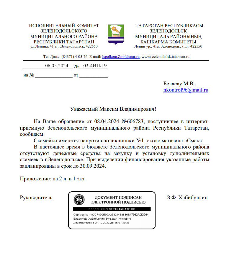 Ответ из Зеленодольска по вопросу отсутствия скамеек