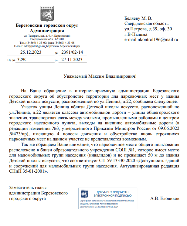 Публикуем ранее поступивший ответ по обращению жителей города Березовский Свердловской области по вопросу отсутствия парковки около Детской Школы искусств.