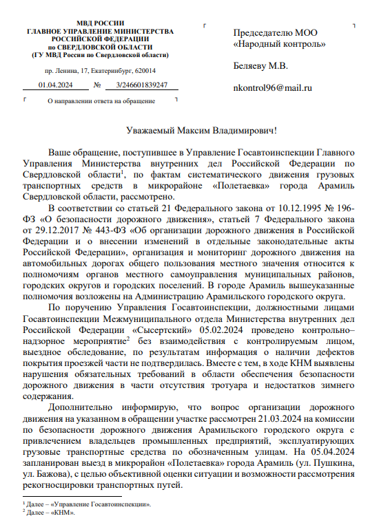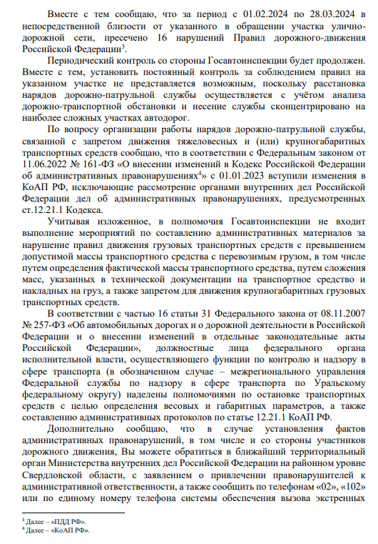 Публикуем ранее поступивший ответ по обращению жителей города Арамиль Свердловской области по вопросу многочисленных нарушений грузовыми ТС правил дорожного движения.
