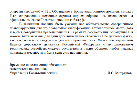 Если Вы стали свидетелем административного правонарушения, включая нарушения ПДД, обратитесь в ближайший орган МВД России в Свердловской области или воспользуйтесь номерами телефонов «02», «102» или «112». Также можно отправить заявление через сервис «прием обращений» на сайте Госавтоинспекции. В заявлении укажите все обстоятельства нарушения, место, дату и время. Вас могут вызвать для дачи объяснений. Для фиксации нарушений используйте технические устройства с привязкой к местности и ясным отображением сути нарушения.