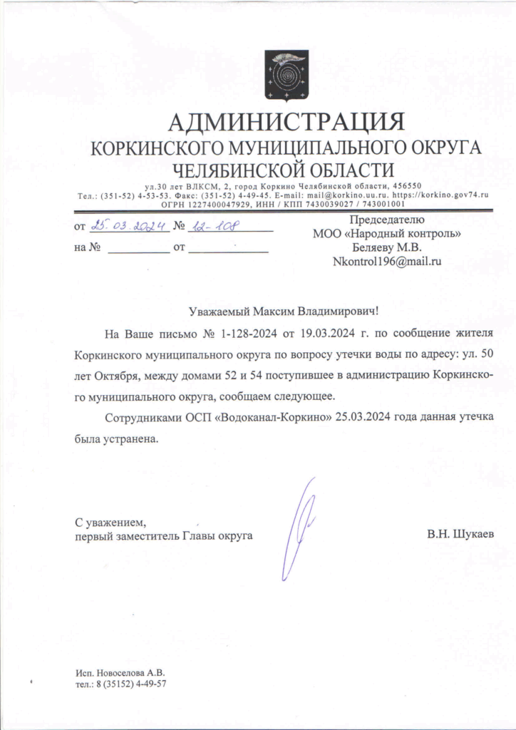 На Ваше письмо № 1- 128-2024 от 19.03.2024 г. по сообщение жителя Коркинского муниципального округа по вопросу утечки воды по адресу: ул. 50 лет Октября, между домами 52 и 54 поступившее в администрацию Коркинского муниципального округа, сообщаем следующее.