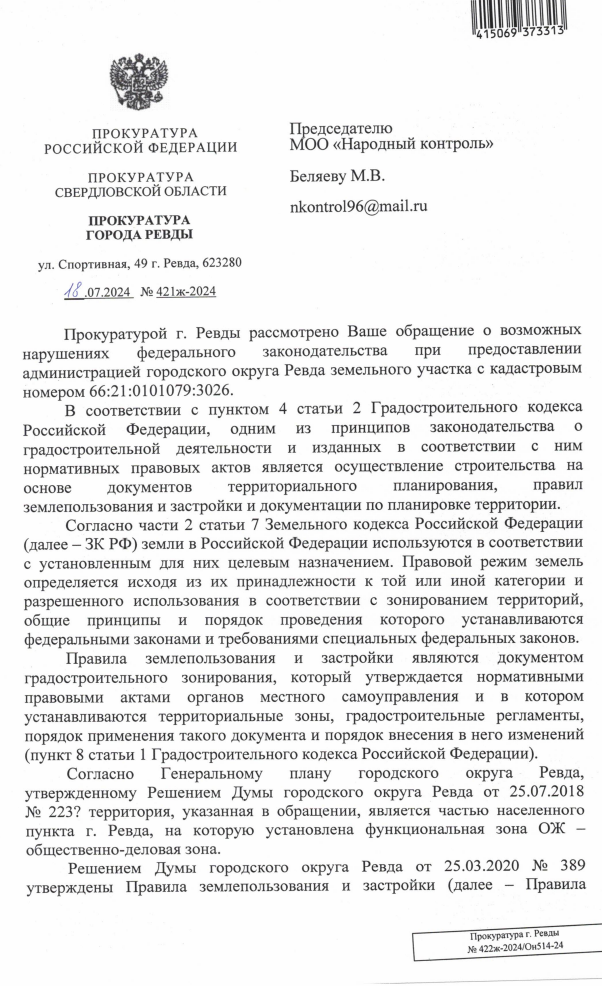 Прокуратура г. Ревды рассмотрела обращение о возможных нарушениях при предоставлении земельного участка с кадастровым номером 66:21:0101079:3026. В ходе проверки было установлено, что земельный участок находится в общественно-деловой зоне, согласно Генеральному плану и Правилам землепользования и застройки городского округа Ревда.