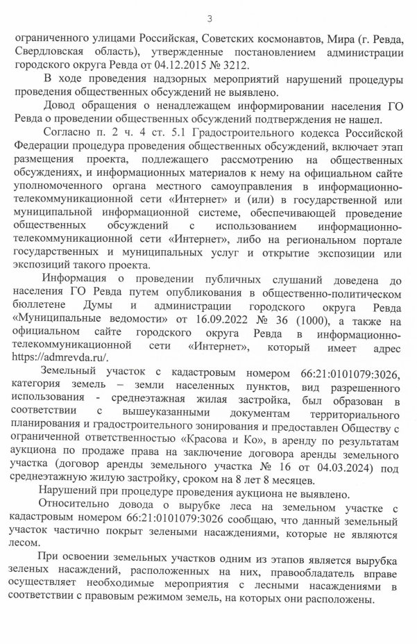 Публикуем ранее поступивший ответ по обращению жителей города Ревда Свердловской области по вопросу строительства многоэтажки на месте леса.