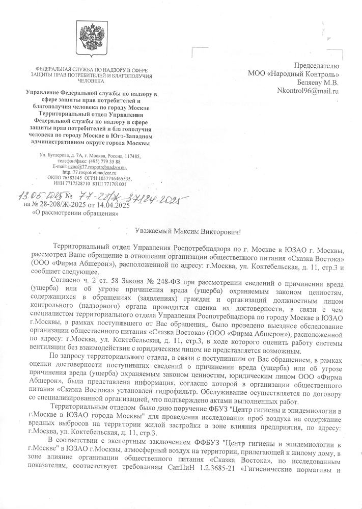 Ответ Роспотребнадзора по жалобам на дым от ресторана «Сказка Востока»
