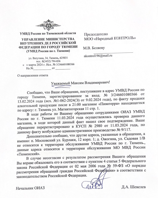 Ваше обращение по факту продажи алкогольной продукции после 21:00 в магазине «Пиватерра» по адресу: г. Тюмень ул. Магнитогорская 11 стр. 1, было проверено сотрудниками ОИАЗ УМВД России по г. Тюмени 11.03.2024 года.