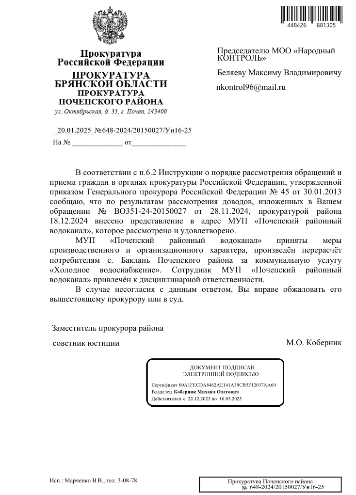 В ответе от 20 января прокуратура Почепского района сообщила, что меры были приняты: произведён перерасчёт для жителей села, а сотрудник МУП «Почепский районный водоканал» привлечён к дисциплинарной ответственности. В случае несогласия с ответом, можно обратиться в суд или к вышестоящему прокурору.