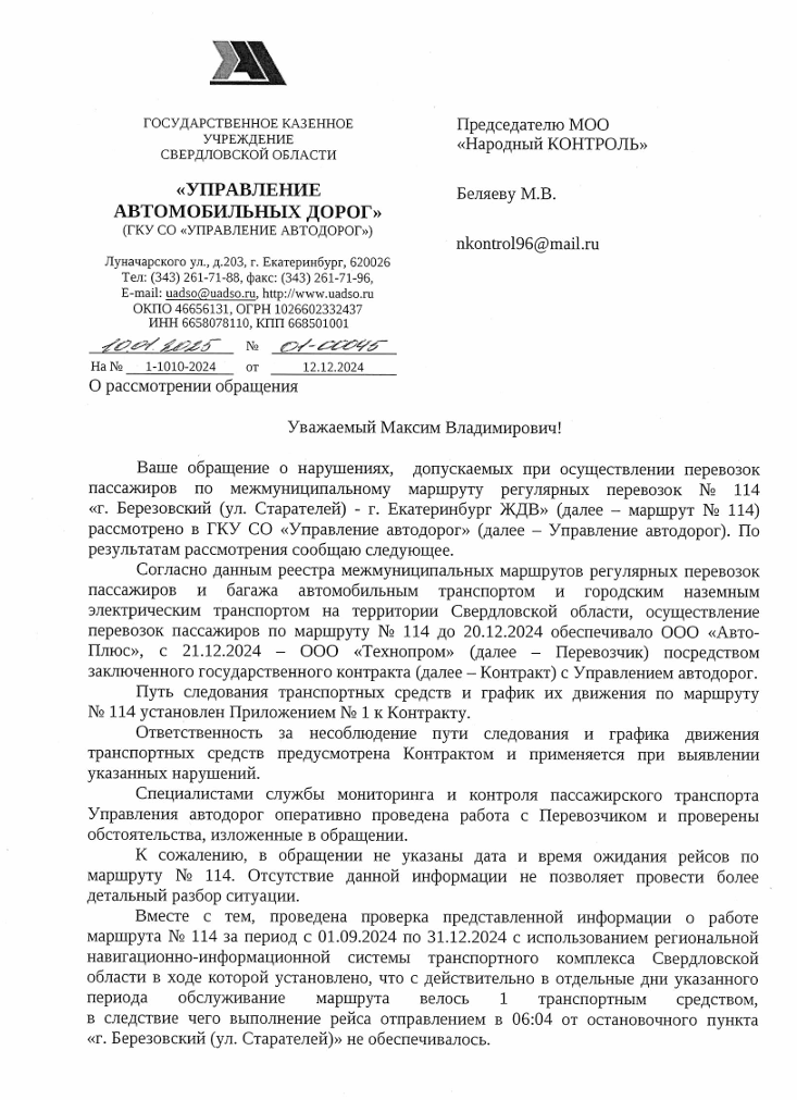 11 декабря 2024 года жители Березовского обратились с жалобой на регулярное отсутствие первого утреннего рейса автобуса №114 по маршруту «Екатеринбург — Березовский». По словам горожан, рейс с отправлением в 6:04 от остановки «Старателей» не выполняется уже более года. Это вызывает серьёзные неудобства, так как данный маршрут является единственным прямым сообщением с Екатеринбургом.