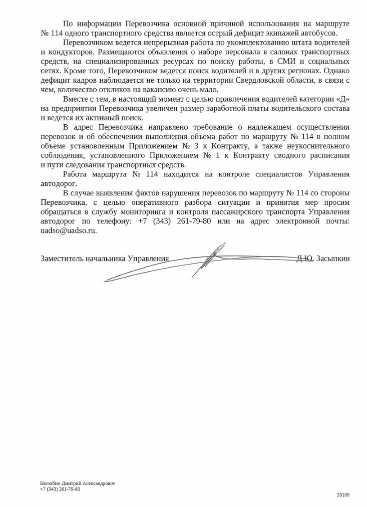 В адрес перевозчика направлено требование о соблюдении графика движения и выполнении объёмов перевозок в полном объёме согласно условиям контракта. Управление автодорог взяло работу маршрута №114 под особый контроль. В случае повторных срывов рейсов гражданам рекомендовано оперативно сообщать о нарушениях в службу мониторинга и контроля пассажирского транспорта по телефону или электронной почте.