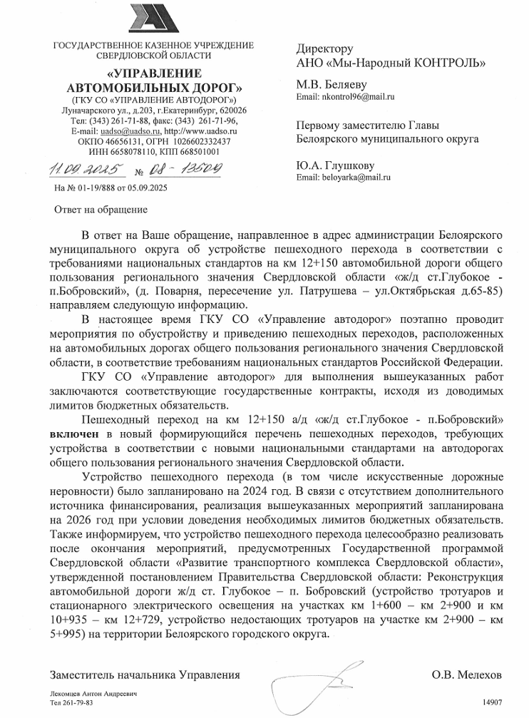 В ответе управления автодорог Свердловской области сообщается, что пешеходный переход на указанном участке дороги включён в перечень объектов, требующих приведения в соответствие с национальными стандартами. Однако работы, первоначально запланированные на 2024 год, перенесены на 2026 год из-за отсутствия финансирования.