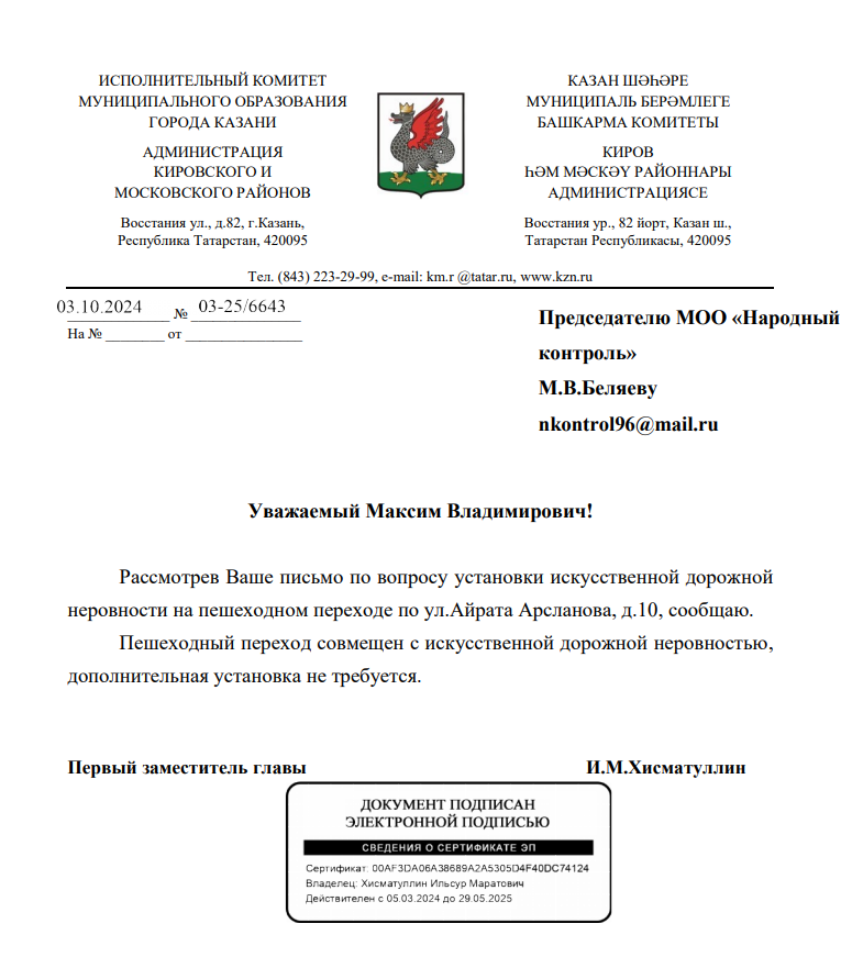 В начале октября было получено обращение от обеспокоенного гражданина, который выразил тревогу по поводу безопасности учеников, переходящих дорогу к лицею № 182 на улице Айрата Арсланова в Казани.