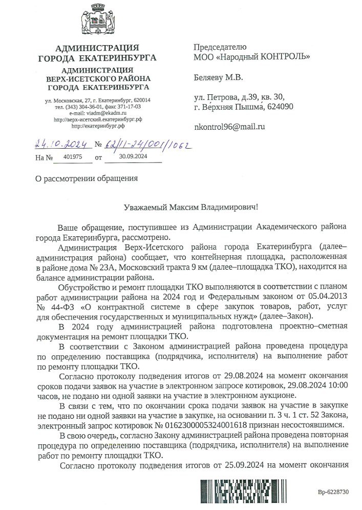 Администрация сообщила, что контейнерная площадка на территории дома № 23А находится на её балансе. В 2024 году была подготовлена проектно-сметная документация для её ремонта. Однако, две попытки найти подрядчика на работы по обустройству площадки не увенчались успехом: ни один из запросов котировок на проведение электронного аукциона в августе и сентябре не привлек заявок, поэтому обе процедуры были признаны несостоявшимися.