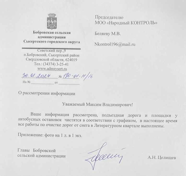 Публикуем ранее поступивший ответ по обращению жителей поселка Бобровский Свердловской области по вопросу очистки автобусной остановки и подъездной дороги в Литературном квартале.
