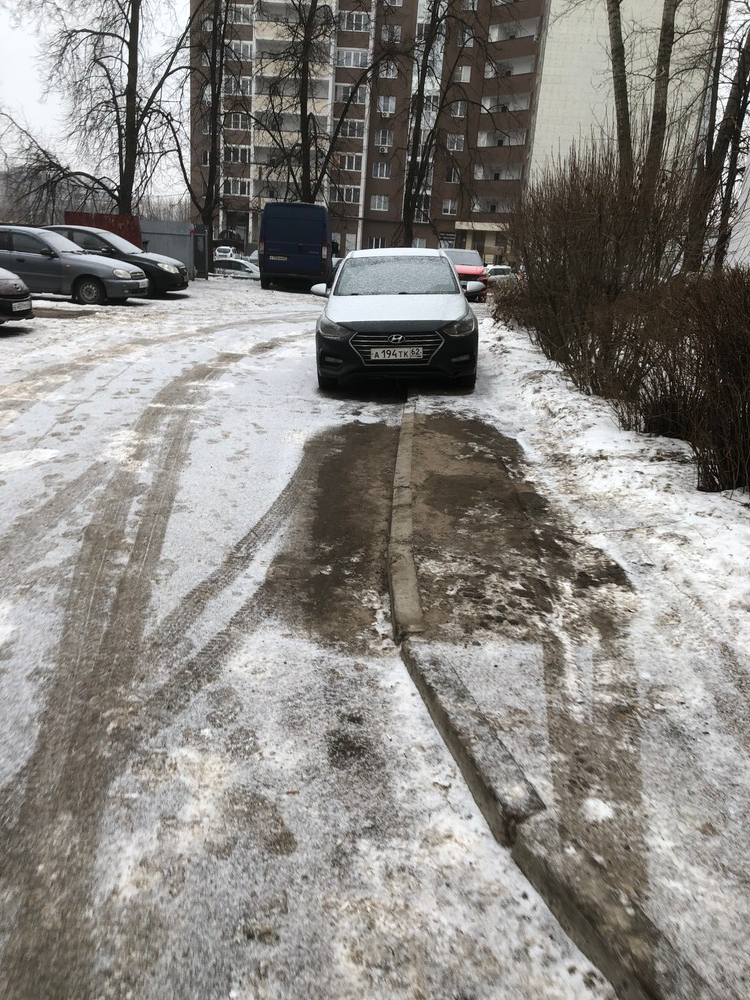 02.03.2025, Рязань, Южный переулок, д. 10. Машина припаркована наполовину на бордюре, что является нарушением правил парковки.