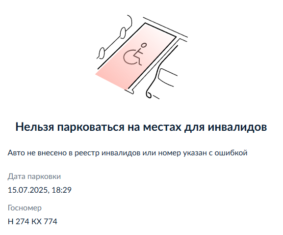 17.07.2025, 22:50, Московская область, г. Одинцово, ул. Белорусская, д. 10, подъезд 2. Парковка на местах для инвалидов. Автомобиль в федеральном реестре инвалидов не зарегистрирован.