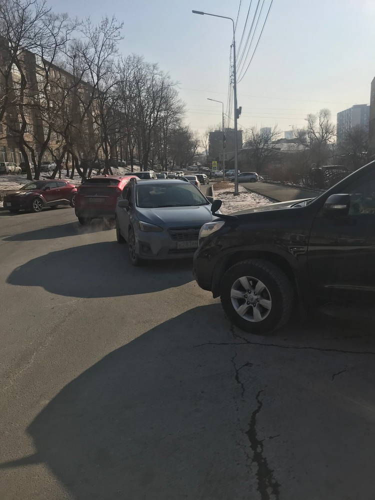 Проехал по встречной и перекрыл полосу встречного движения на перекрёстке. Пытается заехать на встречную полосу медучреждения под шлагбаум без пропуска. Адрес медучреждения: г. Владивосток, ул. Черёмуховая, 11, КДКБ-2.