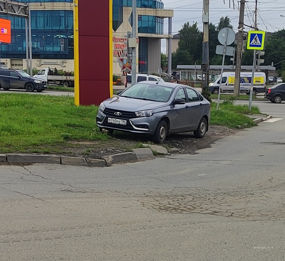 30.07.2025 г., 12:19, г. Екатеринбург, пр. Космонавтов, 17д. Парковка автомобиля на газоне. Lada Vesta, госномер М740НХ196.