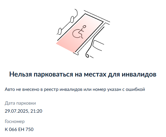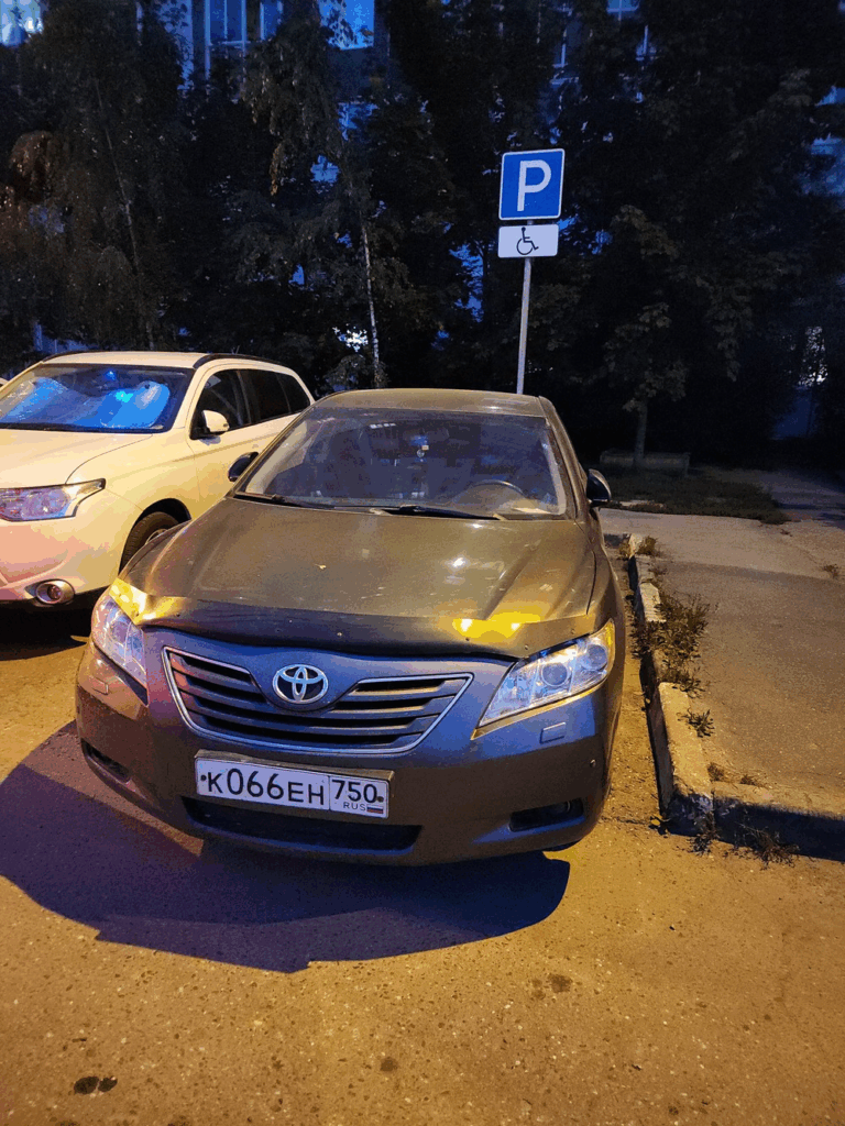 29.07.2025, 21:20. Московская область, г. Одинцово, ул. Белорусская, 10, 2-й подъезд. Toyota, госномер К066ЕН750. Парковка на местах для инвалидов. В федеральном реестре инвалидов автомобиль не зарегистрирован.