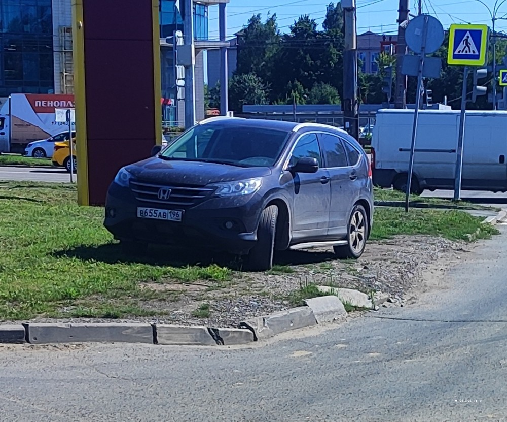 01.08.2025 г., 11:16, г. Екатеринбург, пр. Космонавтов, 17д. Парковка автомобиля на газоне. Honda CR-V, госномер В655АВ196.