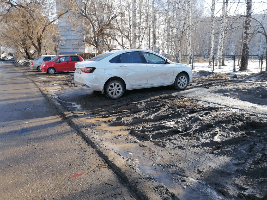 Ежедневно возле ТЦ «Гранат» по адресу г. Ижевск, ул. Ворошилова, д. 44. Автомобили ставят на тротуар, и пешеходам приходится идти прямо по грязи.
