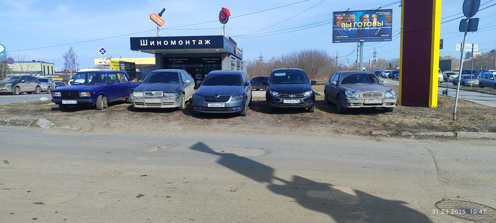 31.03.2025, 10:47, г. Екатеринбург, пр. Космонавтов, д. 17. Массовая парковка автомобилей на газоне. Автомобили: ВАЗ-2107, г.н. Р366КВ45; Skoda Octavia, г.н. В015ХО96; Skoda Octavia, г.н. О800ХМ196; Lada Granta, г.н. С711ОН196; Hyundai Sonata, г.н. К577ХХ96.