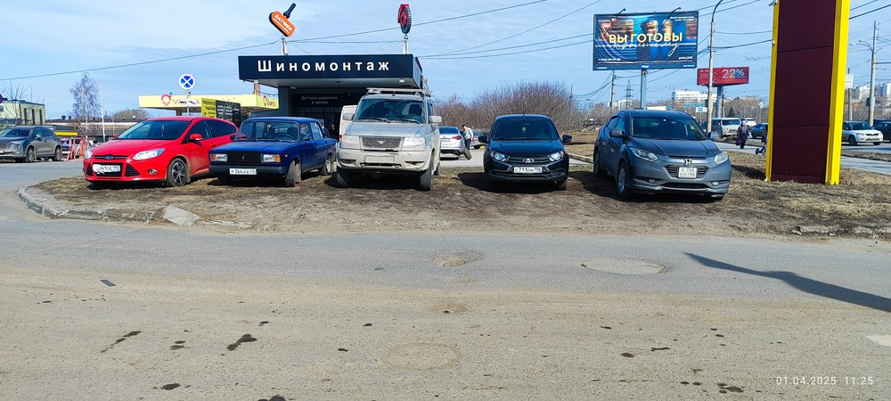 01.04.2025, 11:25, г. Екатеринбург, пр. Космонавтов, д. 17. Массовая парковка автомобилей на газоне. Автомобили: Ford Focus III, г.н. А041ОЕ196 (номер частично скрыт); ВАЗ-2107, г.н. Р366КВ45; UAZ Patriot, г.н. А905СН196; LADA Granta, г.н. С711ОН196; Honda HR-V, г.н. С773СО196.