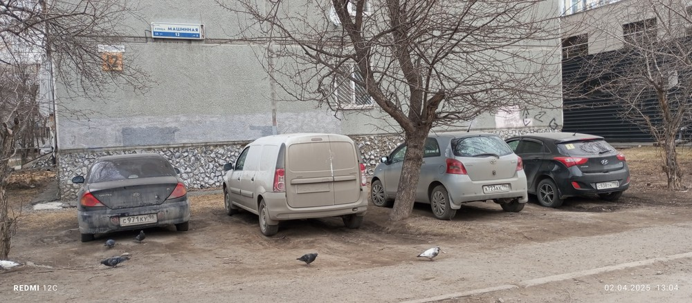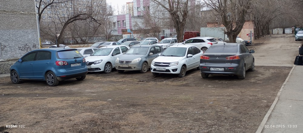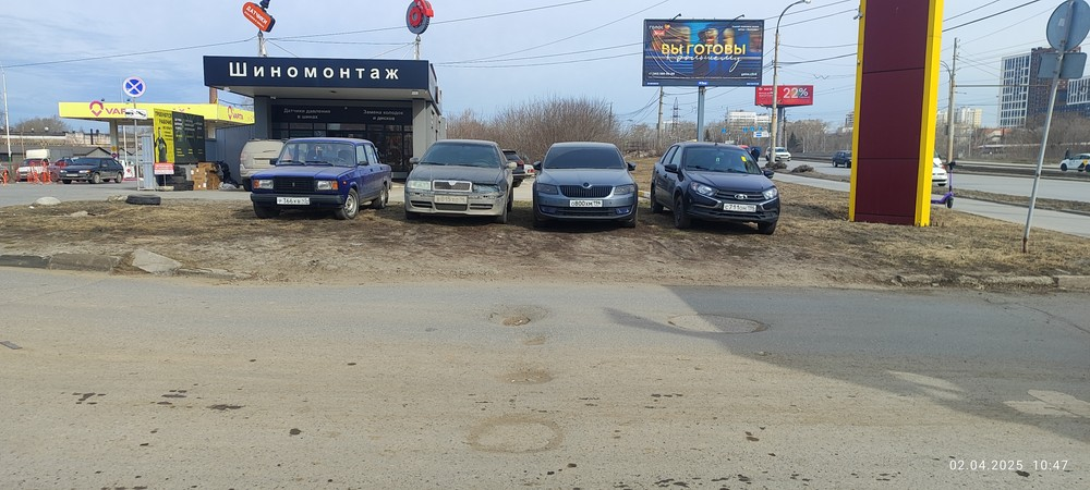 02.04.2025, 10:47, г. Екатеринбург, пр. Космонавтов, д. 17. Массовая парковка автомобилей на газоне. Автомобили: ВАЗ-2107, г.н. Р366КВ45; Skoda Octavia, г.н. В015ХО96; Skoda Octavia, г.н. О800ХМ196; Lada Granta, г.н. С711ОН196.