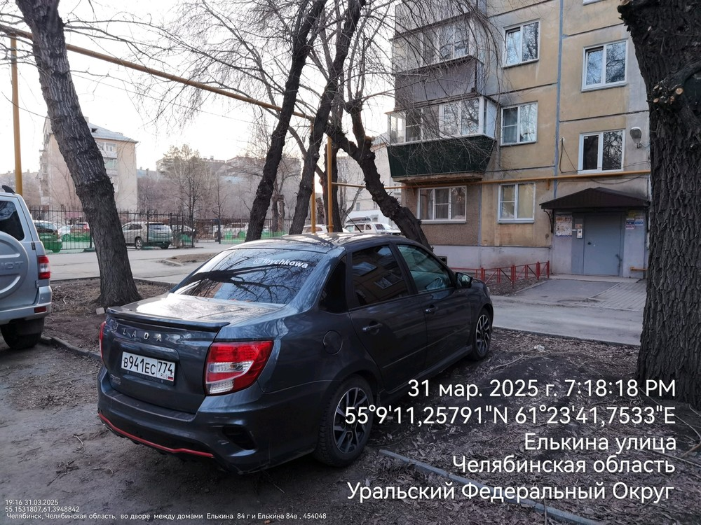 г. Челябинск, Советский район, между домами Елькина, 84 г и Елькина, 84 в. Парковка на обозначенном газоне. Автомобили: Лада, г.н. Р780АН774 и Лада Гранта В941ЕС774