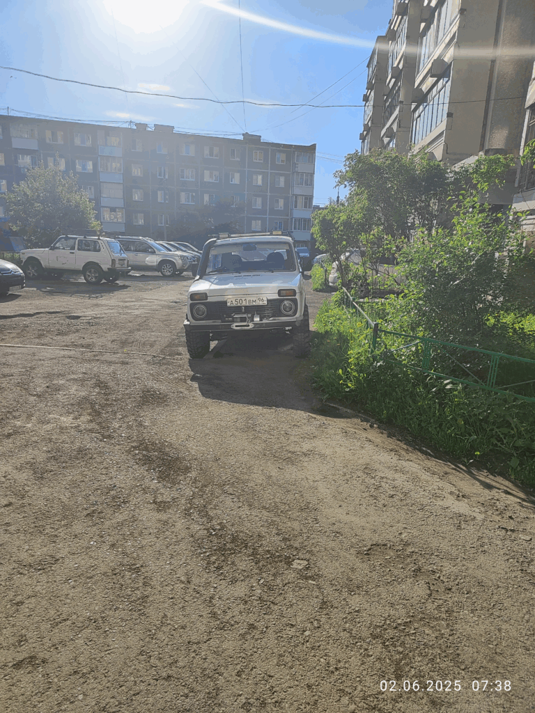 02.06.2025, 07:38. Свердловская область, г. Ревда, ул. Олега Кошевого, д. 31. Темно-синий Volkswagen Golf (госномер Х376ВО196) и Белая Lada Niva (госномер А501ВН96) припаркованы на тротуаре.