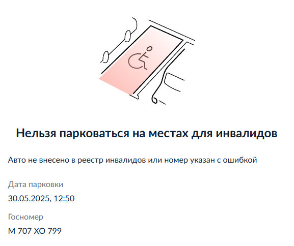 30.05.2025, 07:30. г. Москва, 1-й Неопалимовский пер., д. 15/7. Автомобиль такси неустановленной марки (госномер К328ЕС977) припаркован на месте для инвалидов. ТС не значится в реестре авто инвалидов или перевозящих инвалидов.