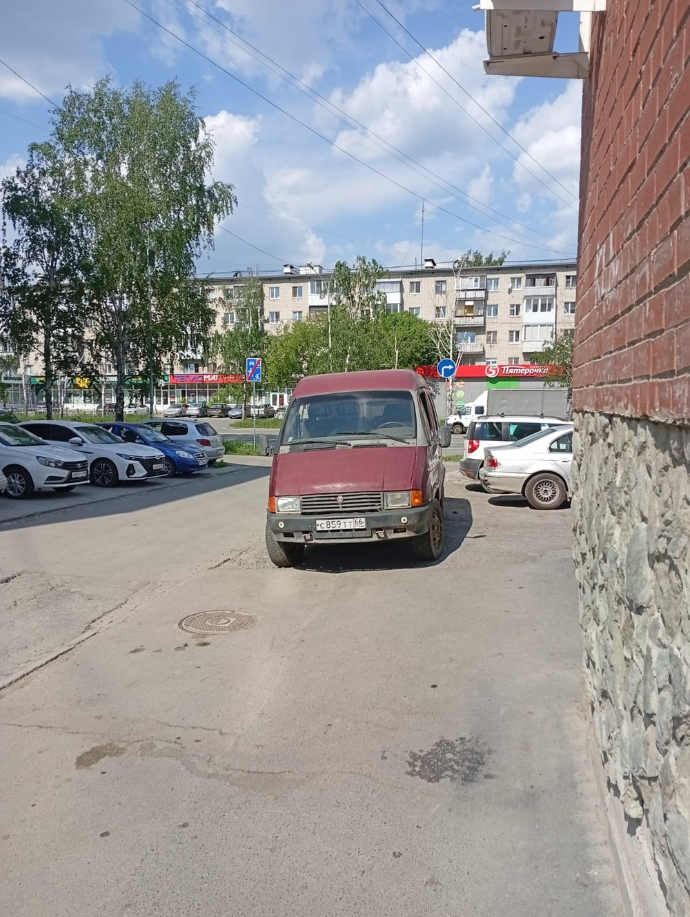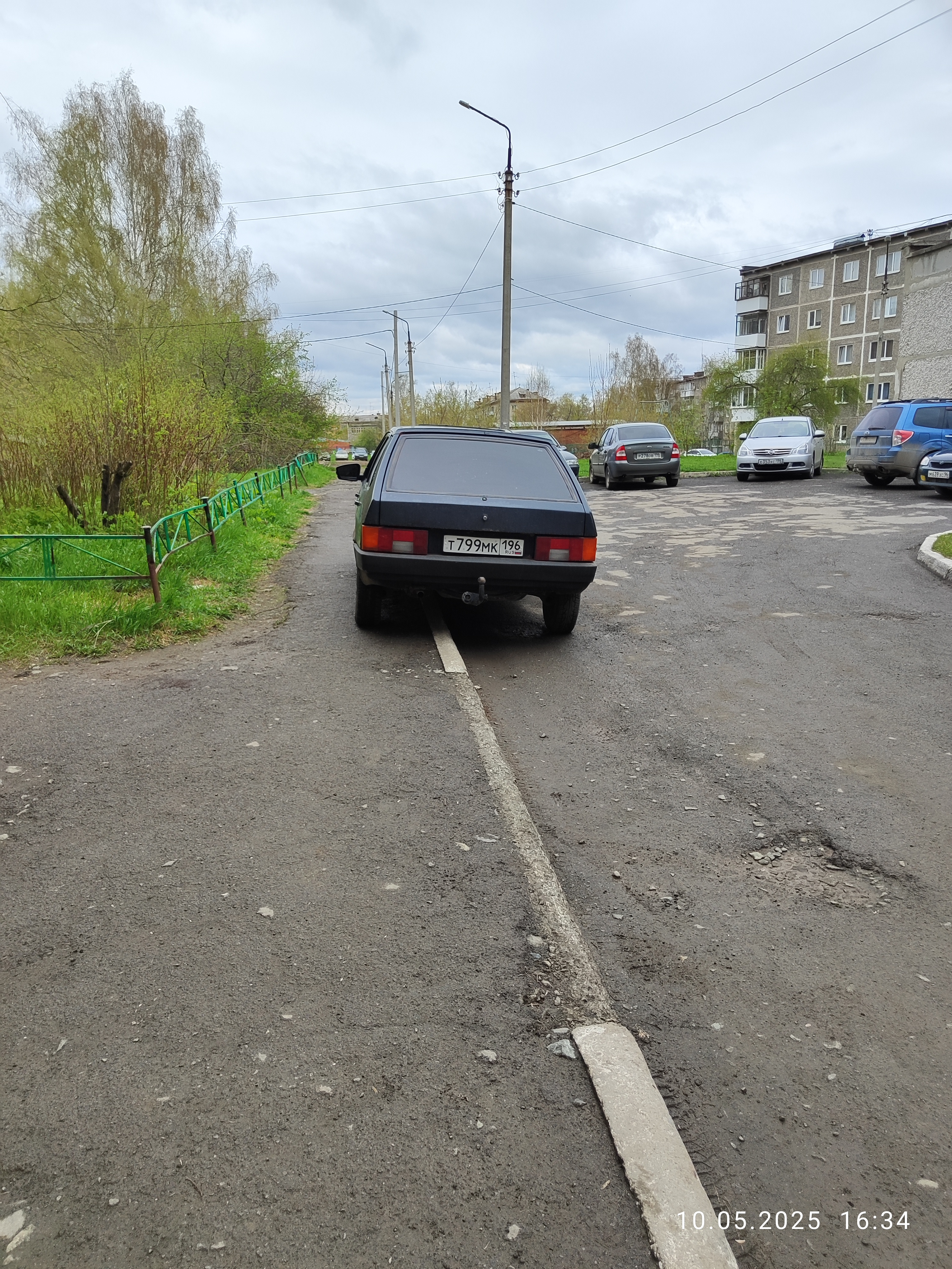 10.05.2025, 16:34. Свердловская область, г. Ревда, ул. Олега Кошевого, д. 31. Автомобиль ВАЗ 2109 (госномер Т799МК196) припаркован на тротуаре, что нарушает пункт 12.2 ПДД РФ.
