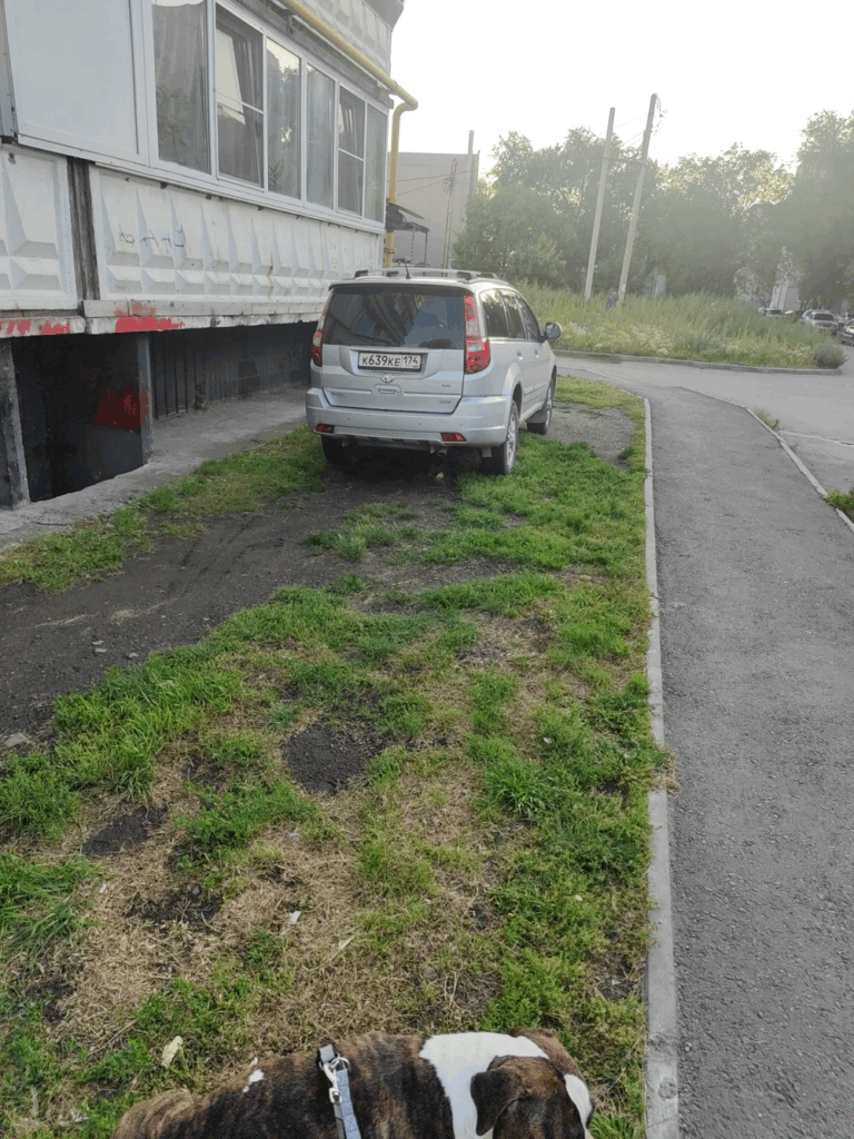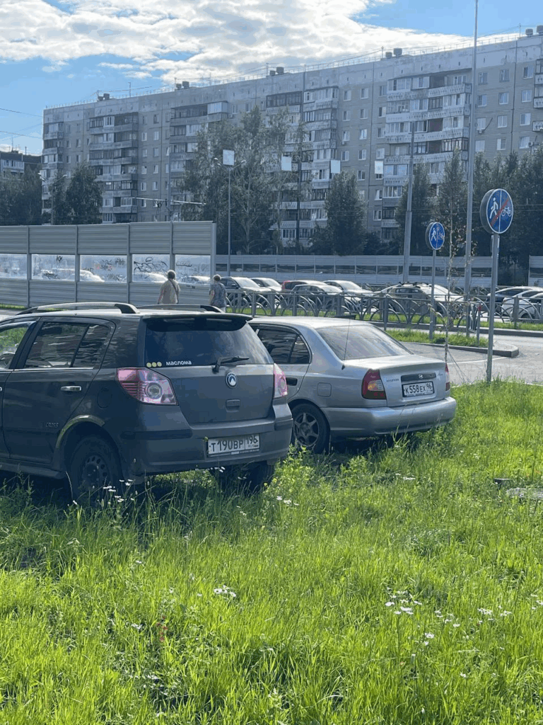 06.07.2025. Екатеринбург, ул. Серафимы Дерябиной, 43. Парковка на газоне. Водители постоянно оставляют автомобили на новом газоне, из-за чего грязь с колёс попадает на дорогу.