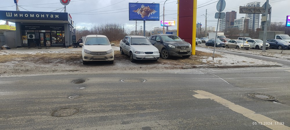 05.12.2024 г., 11:33, г. Екатеринбург, пр. Космонавтов, 17д. Массовая парковка автомобилей на газоне. Автомобили: Lada Granta, г.н. Н718УР196; Daewoo Nexia, г.н. Р803МХ196; Nissan Qashqai, г.н. А014ВР196.