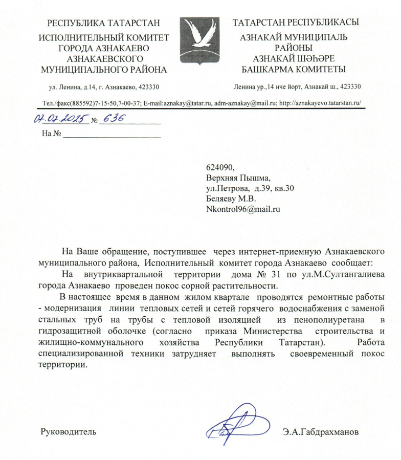 На это обращение был получен ответ от исполнительного комитета города: покос сорной растительности во дворе был проведён, однако регулярное обслуживание осложняется ремонтными работами. В квартале проводится модернизация тепловых и водопроводных сетей, и наличие специализированной техники затрудняет проведение благоустройства в полном объёме.