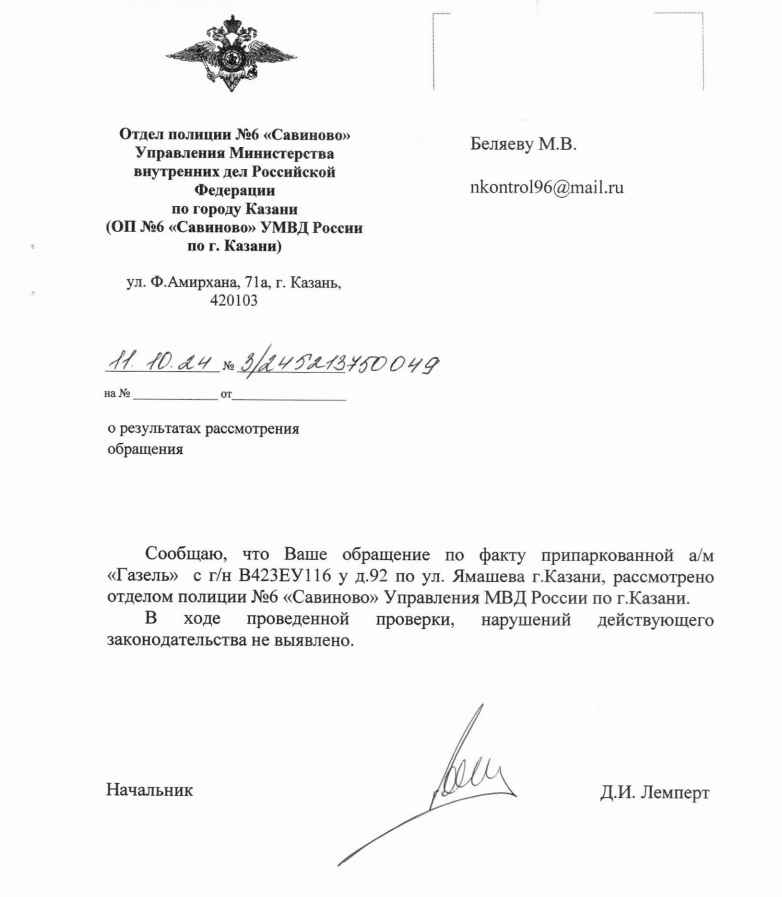 Полицейская проверка не выявила нарушений по поводу припаркованной Газели в Казани