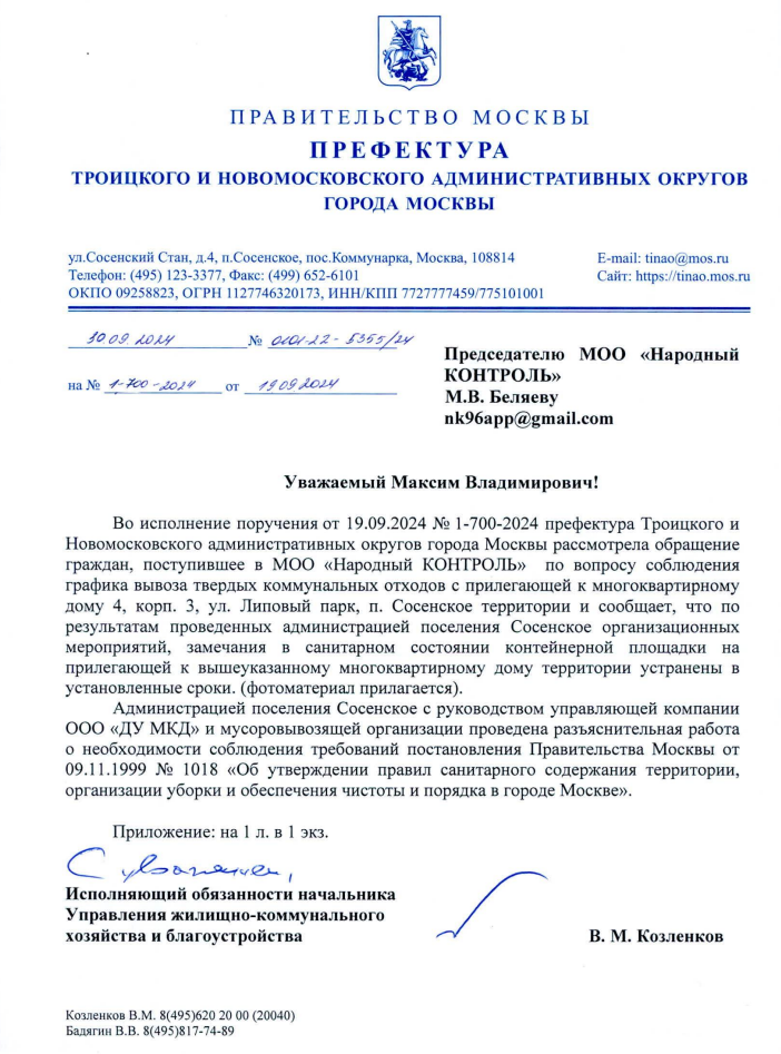 На обращение был получен ответ из префектуры Троицкого и Новомосковского административных округов города Москвы.