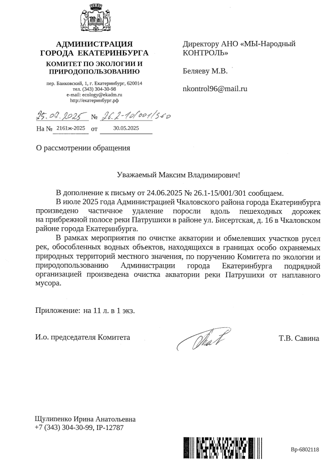На днях был получен новый ответ: администрация сообщила, что в июле вдоль пешеходных дорожек произведено частичное удаление поросли, а подрядной организацией проведена очистка акватории реки Патрушихи от наплавного мусора.