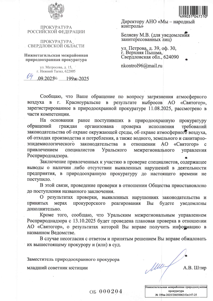 Природоохранная прокуратура сообщила о ходе проверки АО «Святогор» по вопросу о выбросах